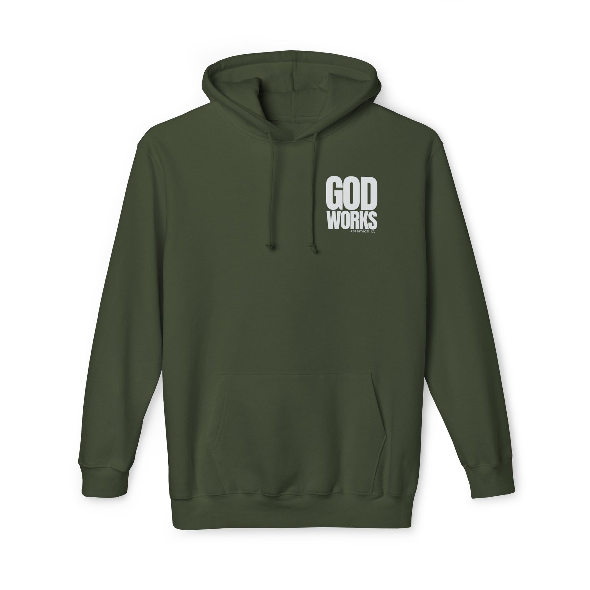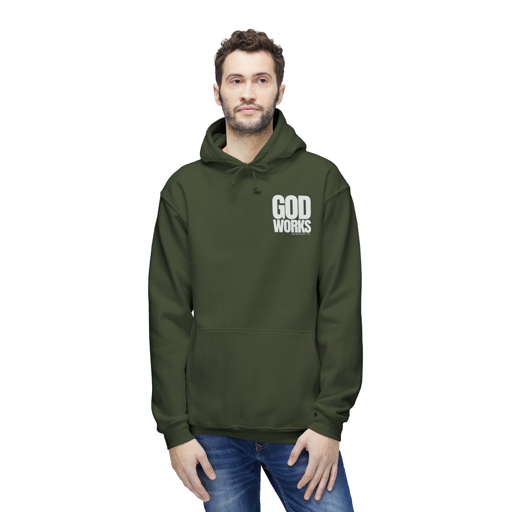 This olive-green hooded sweatshirt carries a quiet, confident message: a small, bold "GOD WORKS" print sits over the heart, suggesting faith lived out rather than shouted. The heavy, structured fabric and classic fit make it feel steady and substantial — the kind of hoodie you reach for when you want comfort that won’t sag or fade. The double-lined hood and roomy front pouch add everyday practicality. Wear it to early morning volunteer meets, Sunday coffee after service, or on slow weekends when you want something that looks intentional without trying too hard. It sits naturally with people who value steady faith and slow devotion — worn by those who show belief through actions and calm presence.