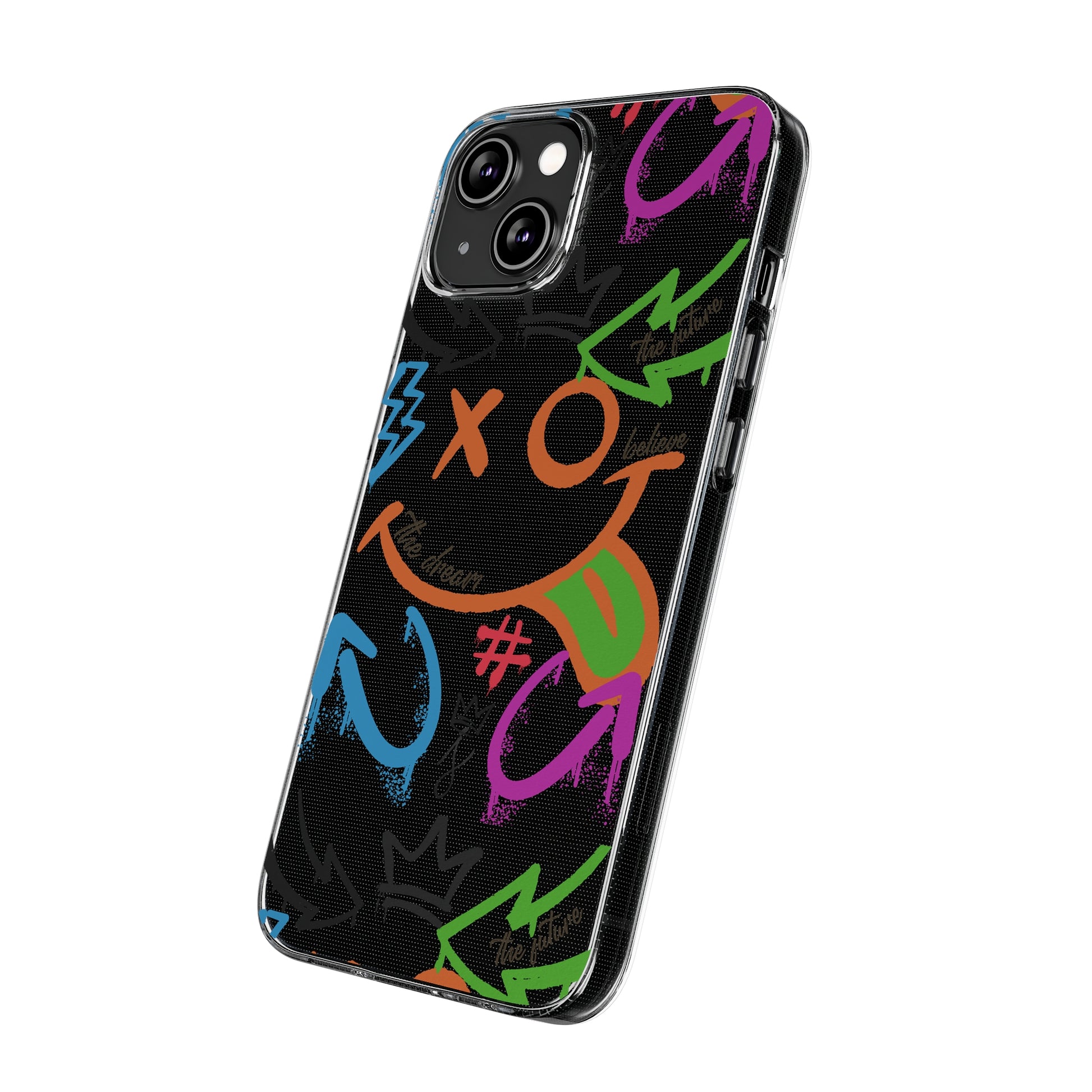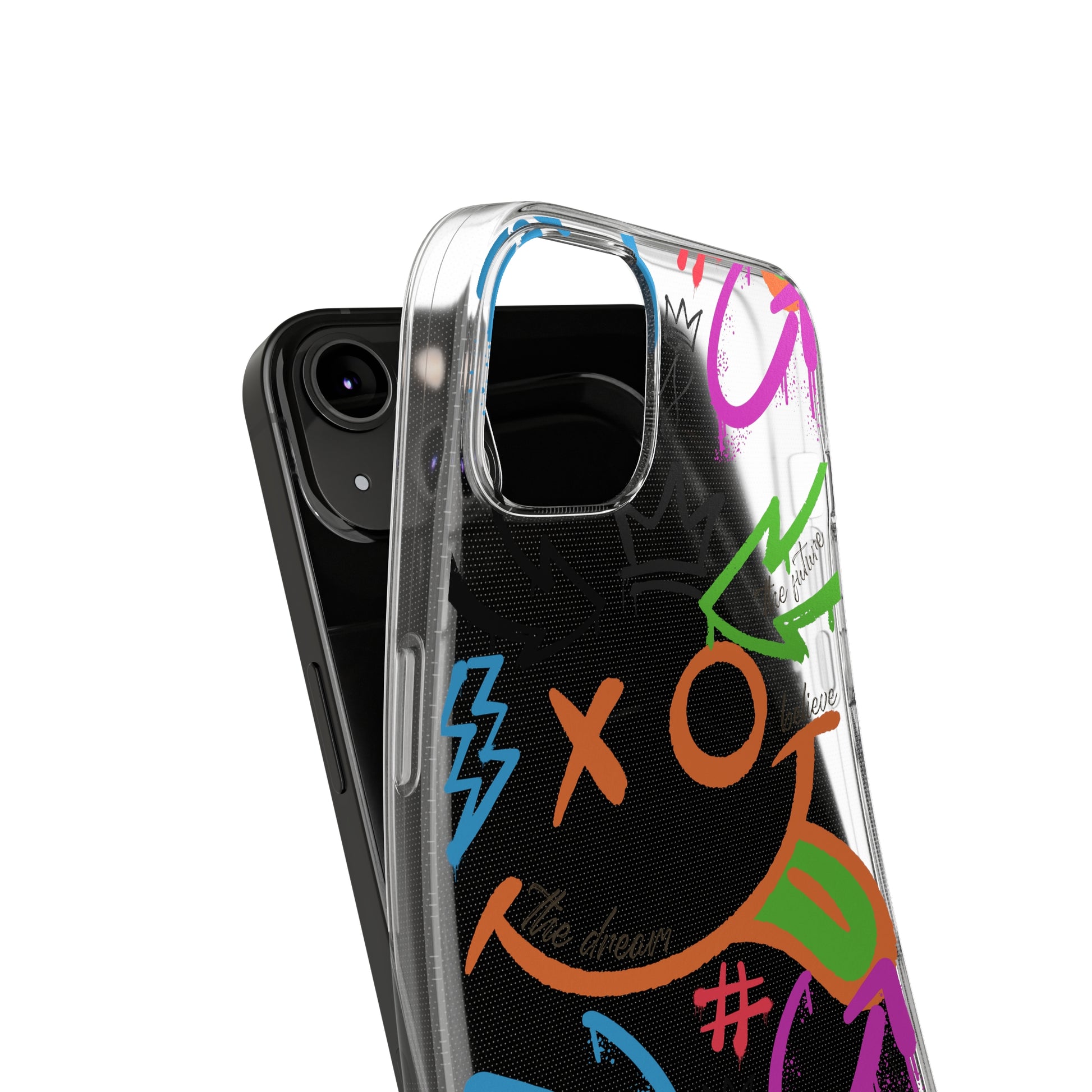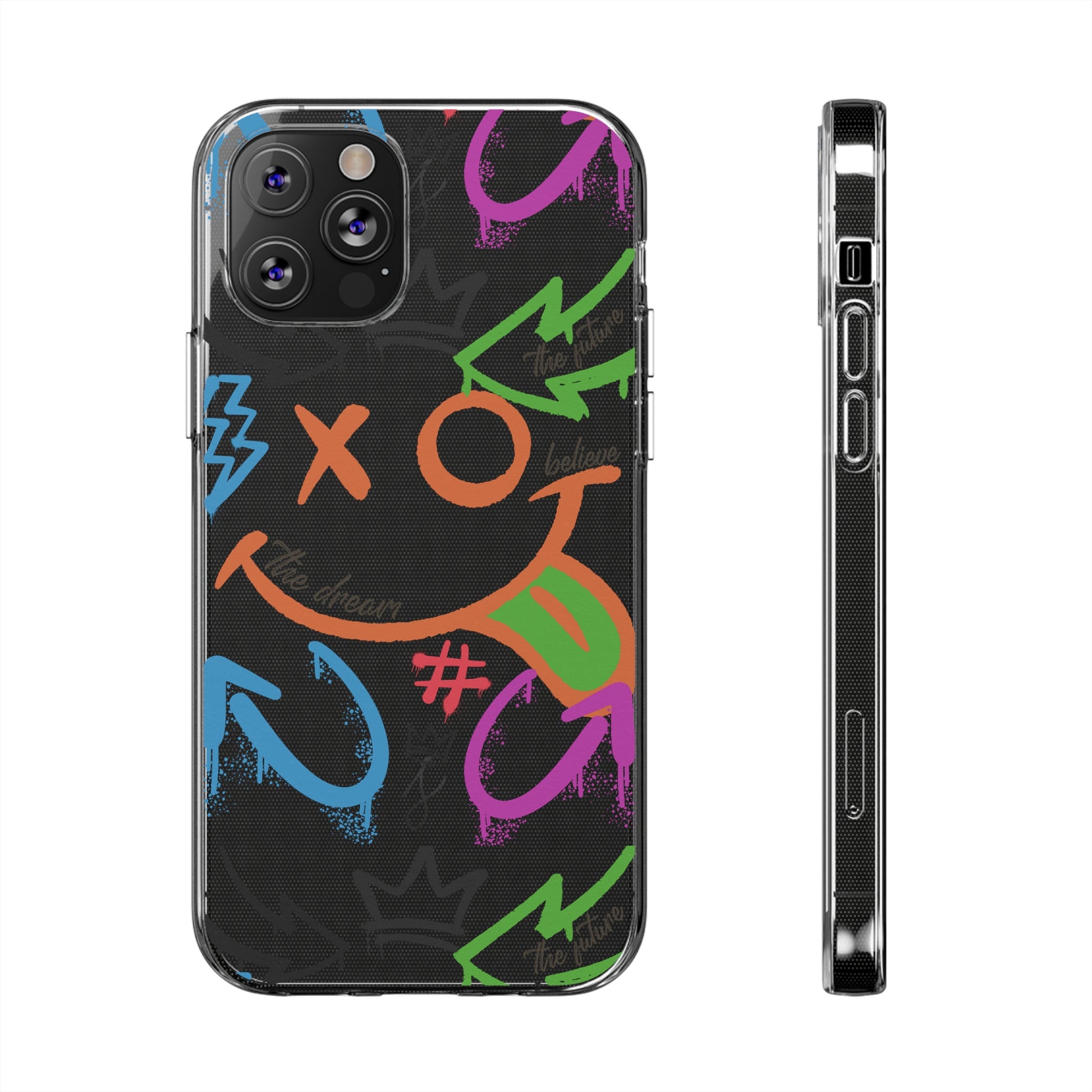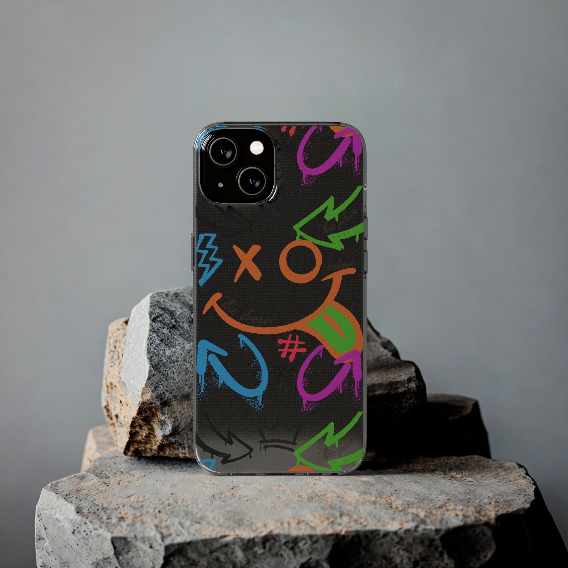 A vibrant and trendy phone case featuring a colorful graffiti street art design. This phone case not only provides protection from scratches but also adds a stunning accent to your device. Made from durable TPU silicone with a clear finish, it is flexible, durable, and has open ports for connectivity. Perfect for those who love street art and want to add a pop of color to their everyday tech accessories. Ideal for gift-giving on birthdays, holidays, and special occasions.